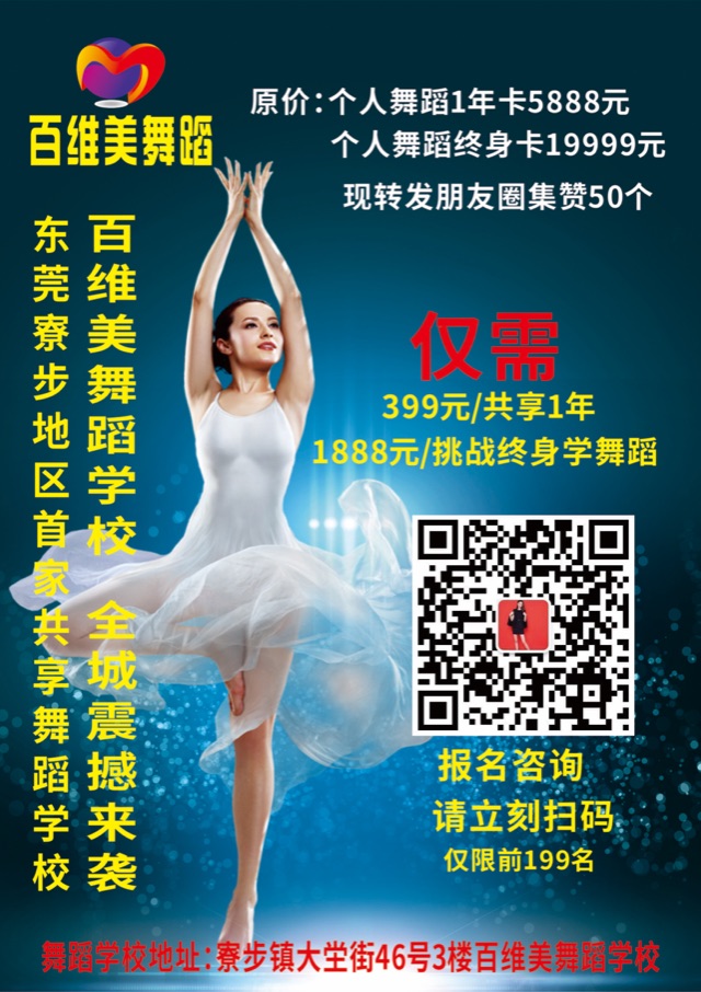 亲!告诉你一个特别重大的消息!100%跟你有关! 寮步地区首家共享舞蹈学校 百维美舞蹈学校 全城震撼来袭 原价:个人舞蹈1年卡5888元 个人舞蹈终身卡19999元 现转发朋友圈积攒50个 仅需 399元/共享1年 1888元/挑战终身 名额仅限前199位! 老会员优先! 现在!立刻!马上! 扫二维码找我报名参加