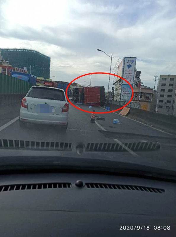 突发!莞樟路高架桥发生一起大型货车翻车事故!